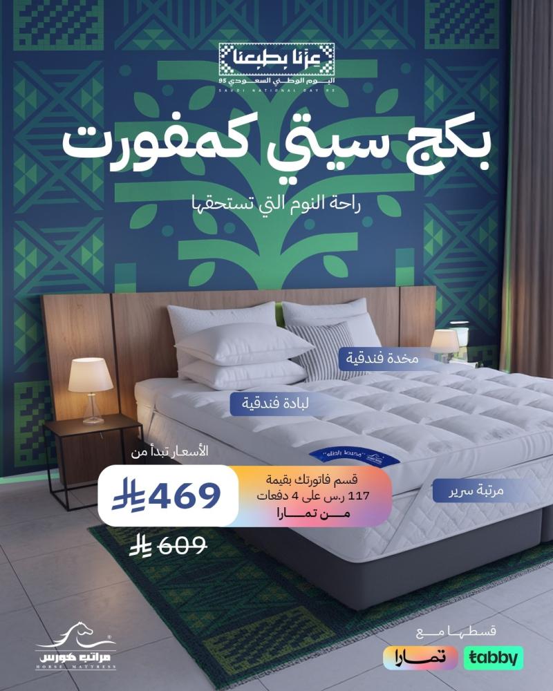 رفاهية فندقية بمنزلك مع بكج «سيتي كمفورت». هذا البكج يجمع كل ما تحتاجه لتجربة نوم مثالية بلمسة فاخرة. البكج يشمل مرتبة سرير بتصميم ممتاز، لبادة سرير فندقية، ومخدة فندقية ناعمة.
