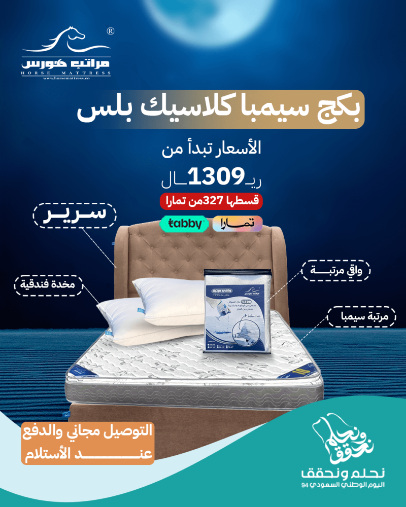 تجربة نوم لا مثيل لها مع باقة سيمبا كلاسيك بلس من مراتب هورس. سرير تفصيل يتم تصميمه حسب رغبتك، من حيث اللون، القماش، والمقاس، ليكون مطابقًا تمامًا لما تريده.