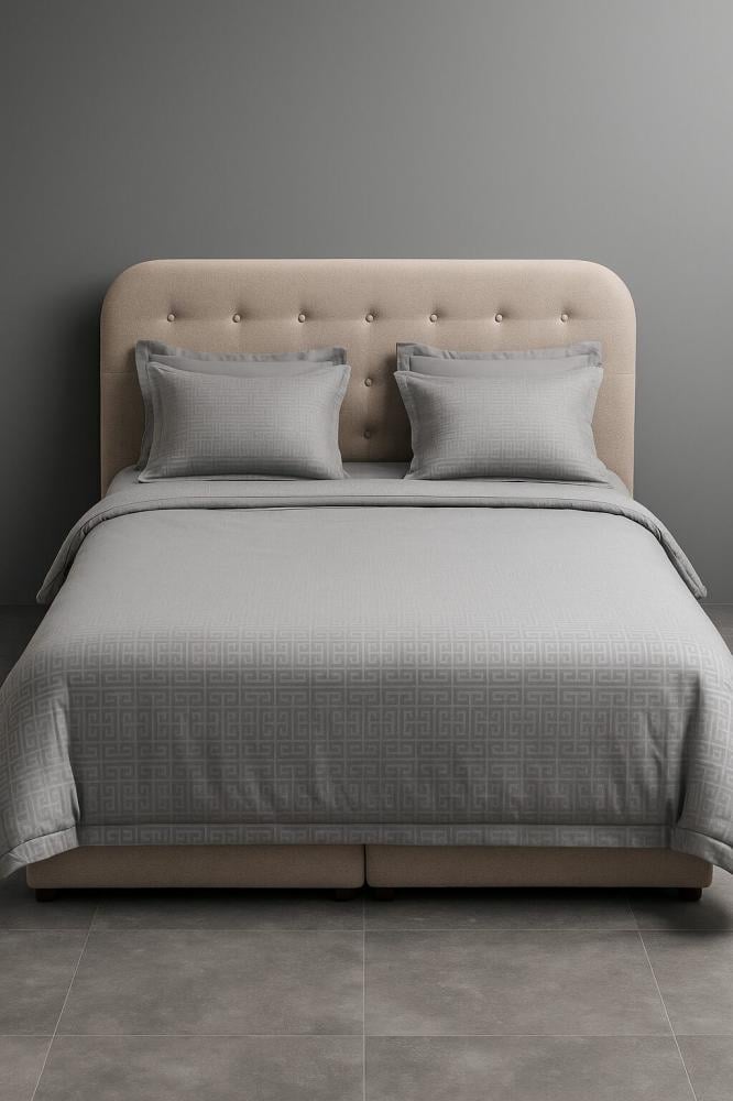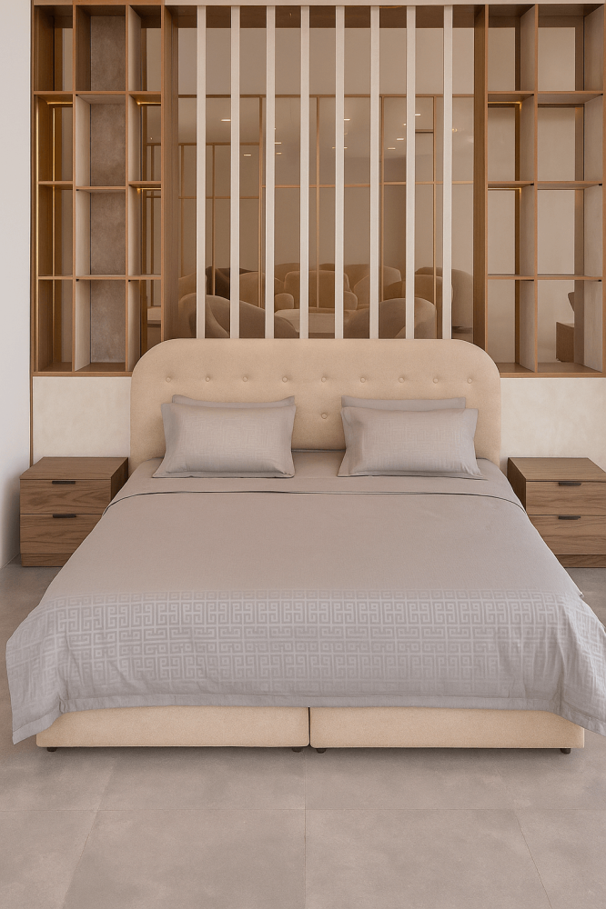 🛏️ مفرش سرير فندقي فاخر نفرين رمادي – 7 قطع بتصميم يوناني وحشوة متحركة - من مفارش هورس