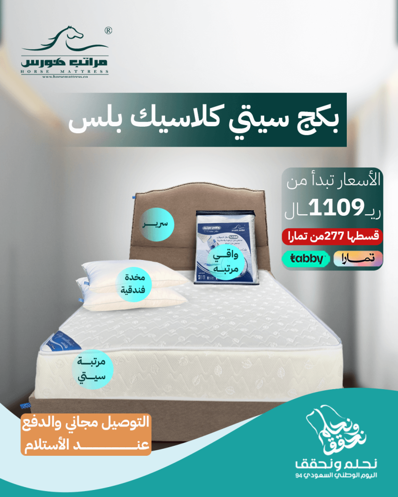 عيش تجربة نوم لا مثيل لها مع بكج سيتي كلاسيك بلس. سرير تفصيل فاخر، مرتبة سيتي المميزة، مخدة فندقية ناعمة، وواقي مرتبة ضد الماء. اطلب الآن واستمتع بتوصيل مجاني وخيارات دفع مريحة.