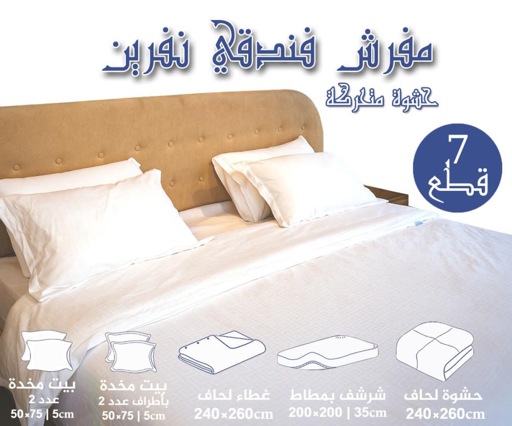مفرش فندقي نفرين 7 قطع أبيض بحشوة متحركة من مفارش هورس. تصميم أنيق وخامة ناعمة قابلة للغسل بسهولة. اطلب الآن لتجربة نوم فندقية مريحة تدوم.